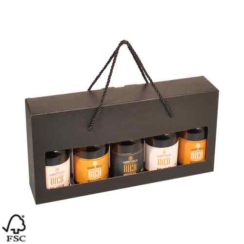 5-fles steinie “dikbuik” FSC Mix bierdoos zwart + koord