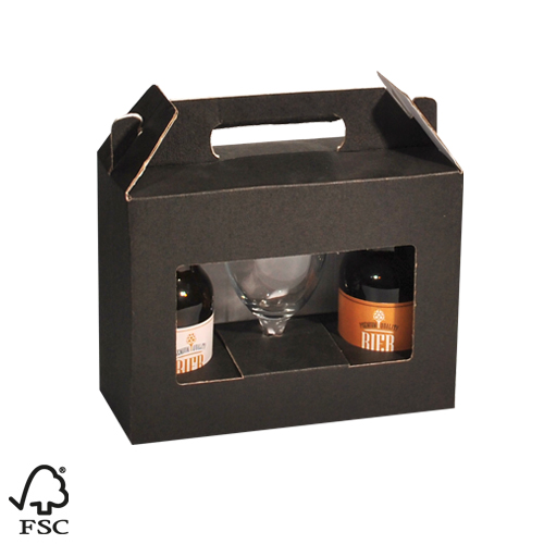 bierdoos t.b.v. 2-fles longneck 30-33cl. + glas zwart lino Steinie “dikbuik” FSC MIX draagmodel