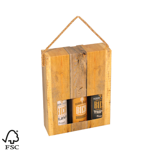 bierdoos 3-fles houtnerf FSC MIX draagmodel + koord longneck 30-33cl.