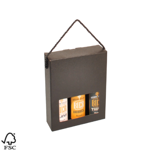 bierdoos 3-fles zwart lino FSC MIX draagmodel + koord longneck 30-33cl.