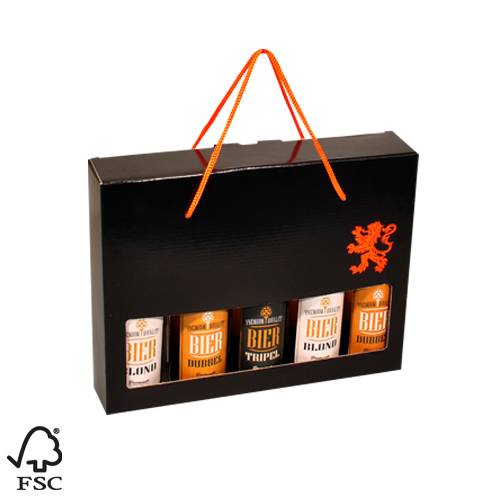 Biergeschenkdoos 5-FLES ORANJE LEEUW FSC MIX Draagmodel + koord longneck 30-33cl.